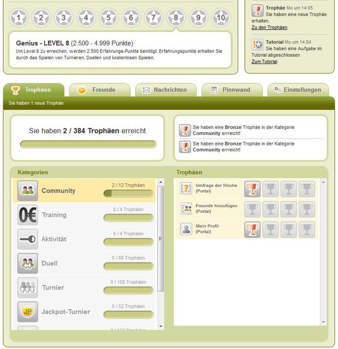 Tipp24Games hat einige neue Features integriert. Die wohl bedeutendste Neuerung ist, dass man nun beim Spielen auf Tipp24Games Erfahrungspunkte sammeln kann. Für jede Aktion, die man tätigt, sei es sich in der Community zu beteiligen, ein Duell oder Turnier zu spielen, an der Umfrage der Woche teilzunehmen oder Freunde hinzuzufügen, erhält man nun eine Trophäe.